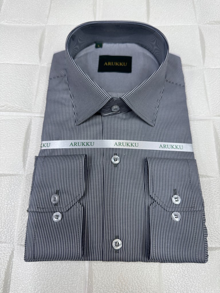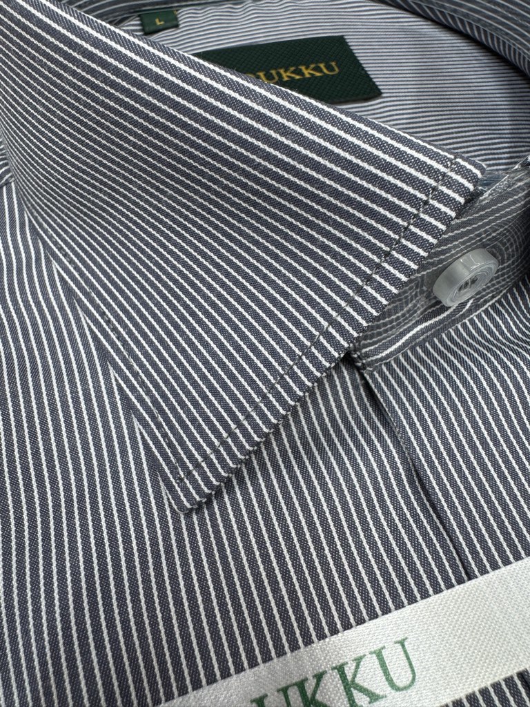 پیراهن مردانه آستین بلند راه راه ریز زمینه طوسی تیره قواره آزاد تک جیب همای