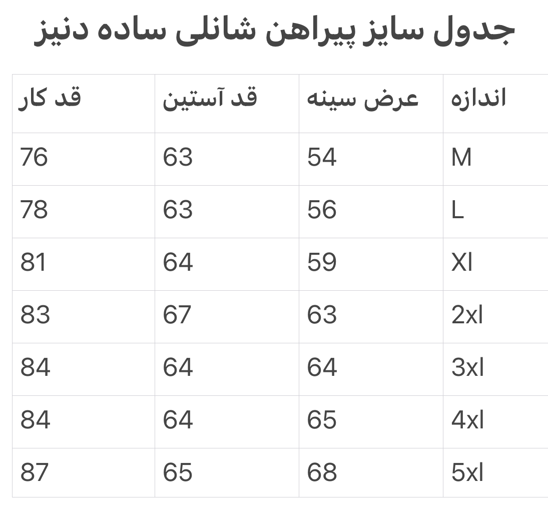 جدول سایز پیراهن ساده آستین بلند تک جیب قواره آزاد همای
