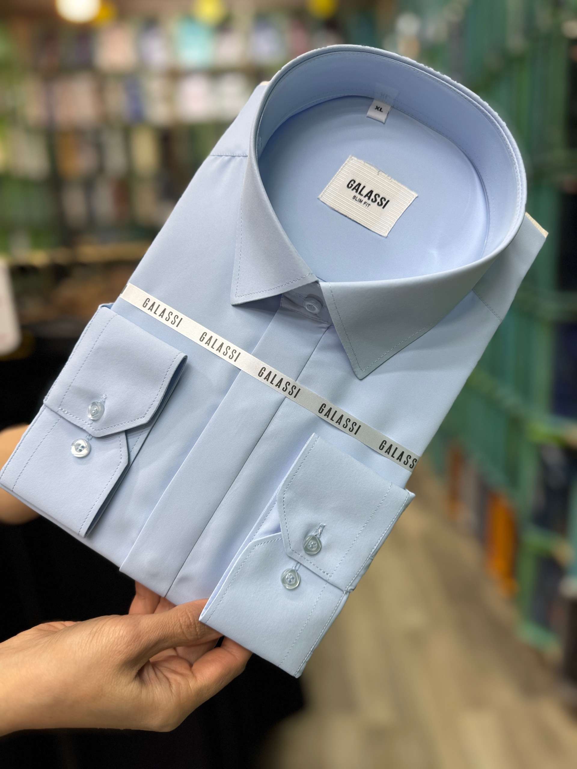 پیراهن مردانه آستین بلند آبی روشن پارچه دوشین اسلیم فیت دکمه مخفی بدون جیب همای کد ۱۱۱۰۲۱