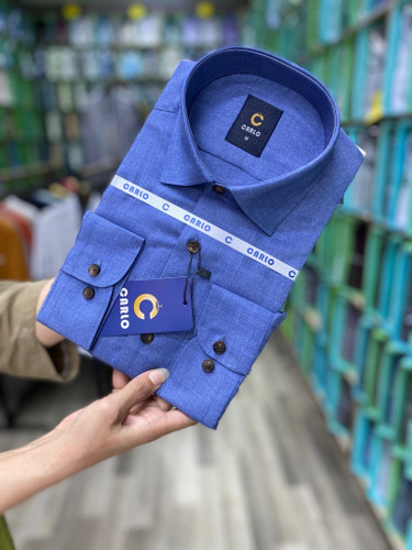 پیراهن مردانه پارچه نخی آستین بلند تک جیب آبی وسط قواره آزاد کد ۴۰۰۰۲