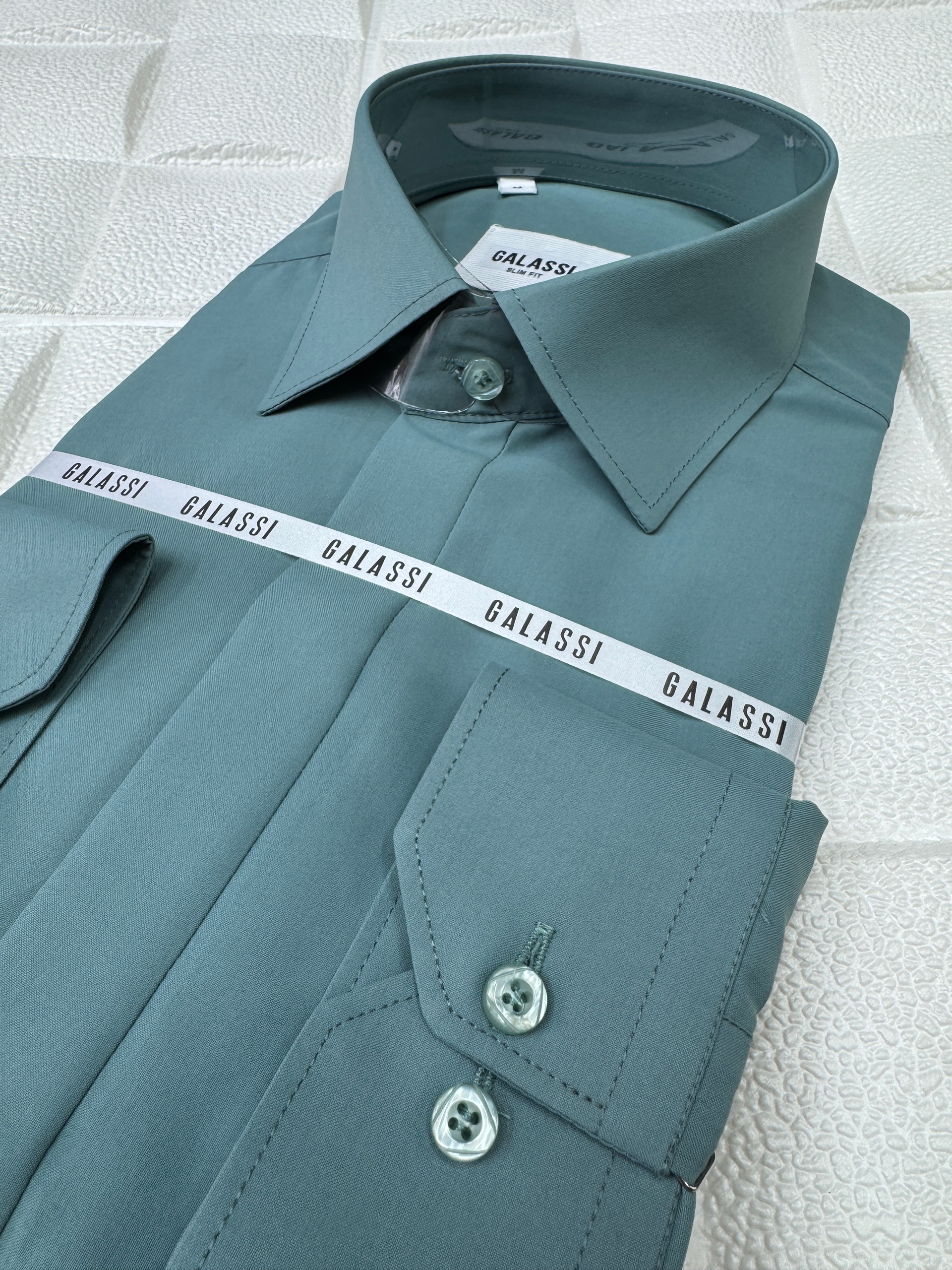 پیراهن مردانه آستین بلند سبز پارچه دوشین اسلیم فیت دکمه مخفی بدون جیب همای کد ۱۱۱۰۲۵