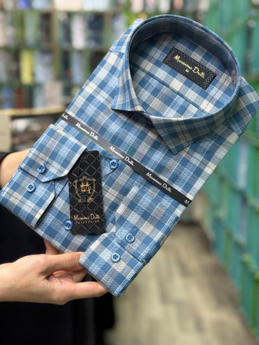 پیراهن مردانه پارچه نخی آستین بلند تک جیب آبی وسط قواره آزاد کد ۴۰۰۰۲