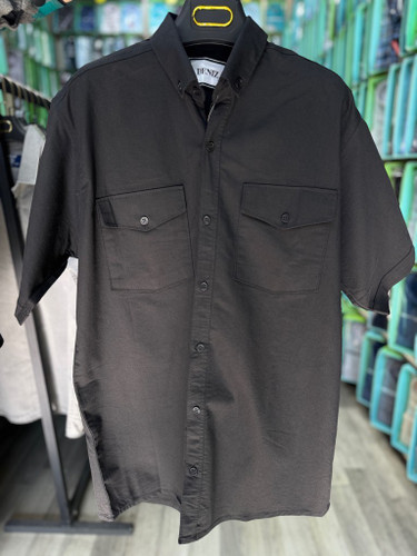 پیراهن کتان کش سنگ شور آستین کوتاه مشکی دو جیب قواره آزاد همای کد ۴۳۳۸۱